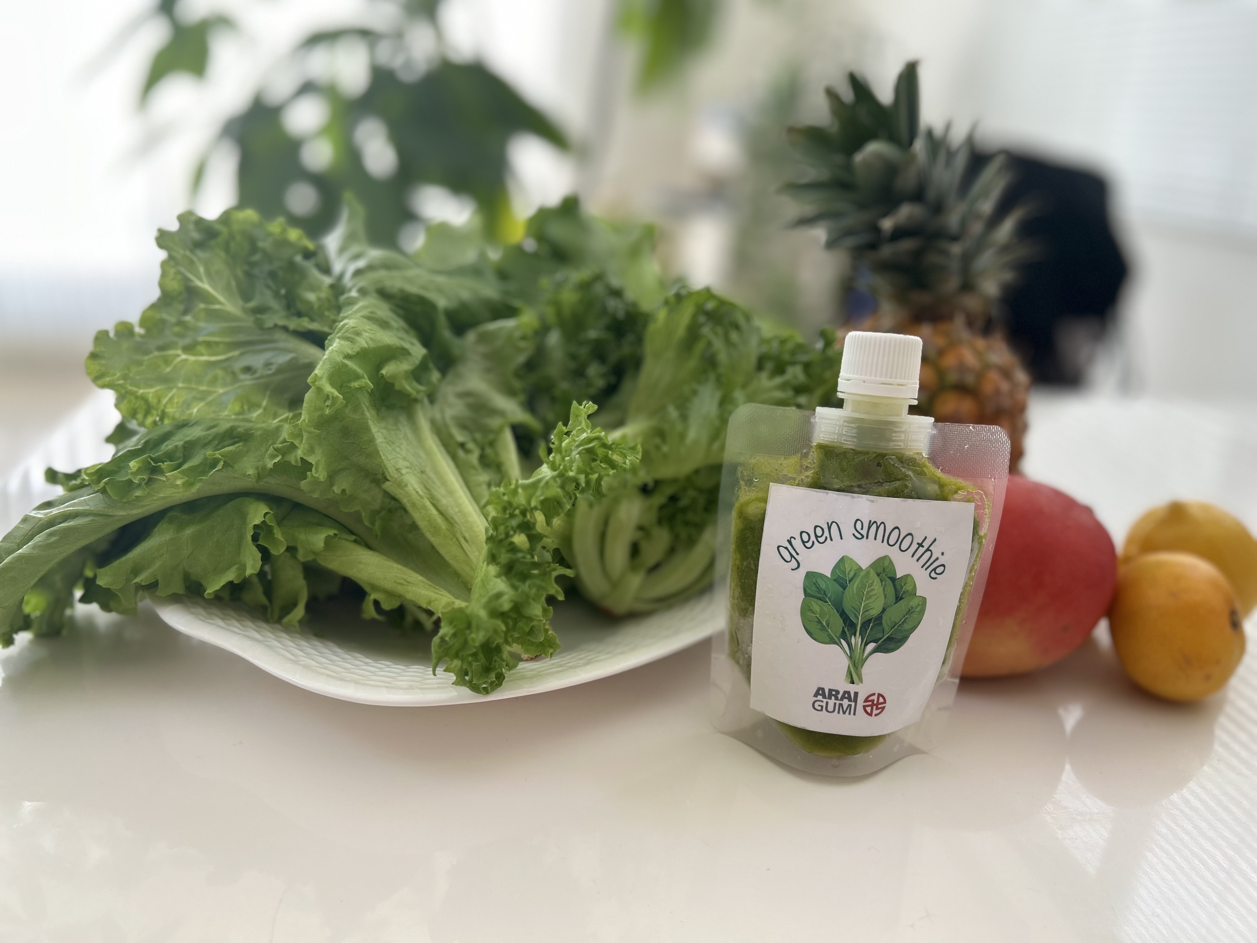新井組が育てた健康野菜の中から、小松菜を原材料にしてグリーンスムージーをつくっています。