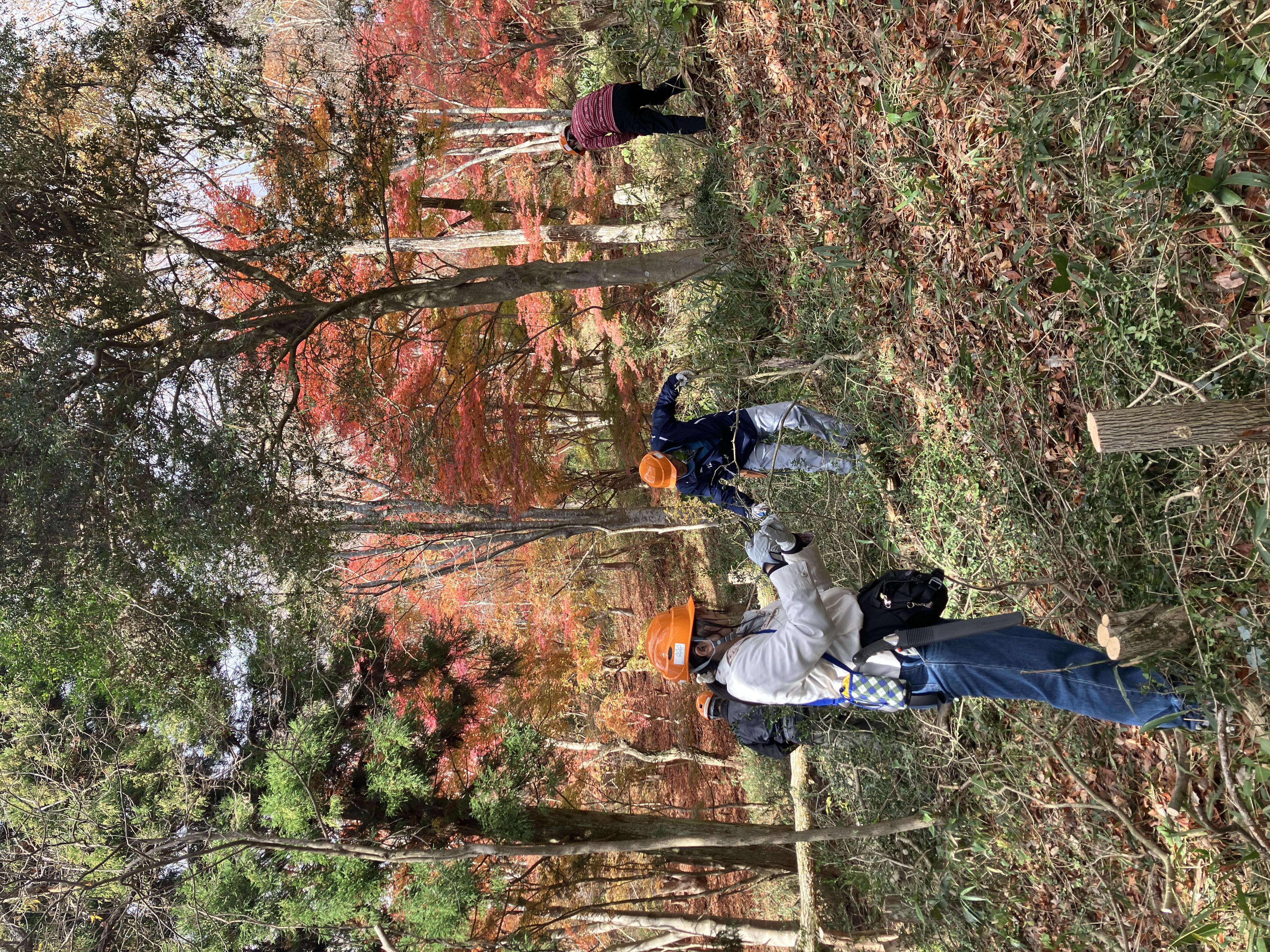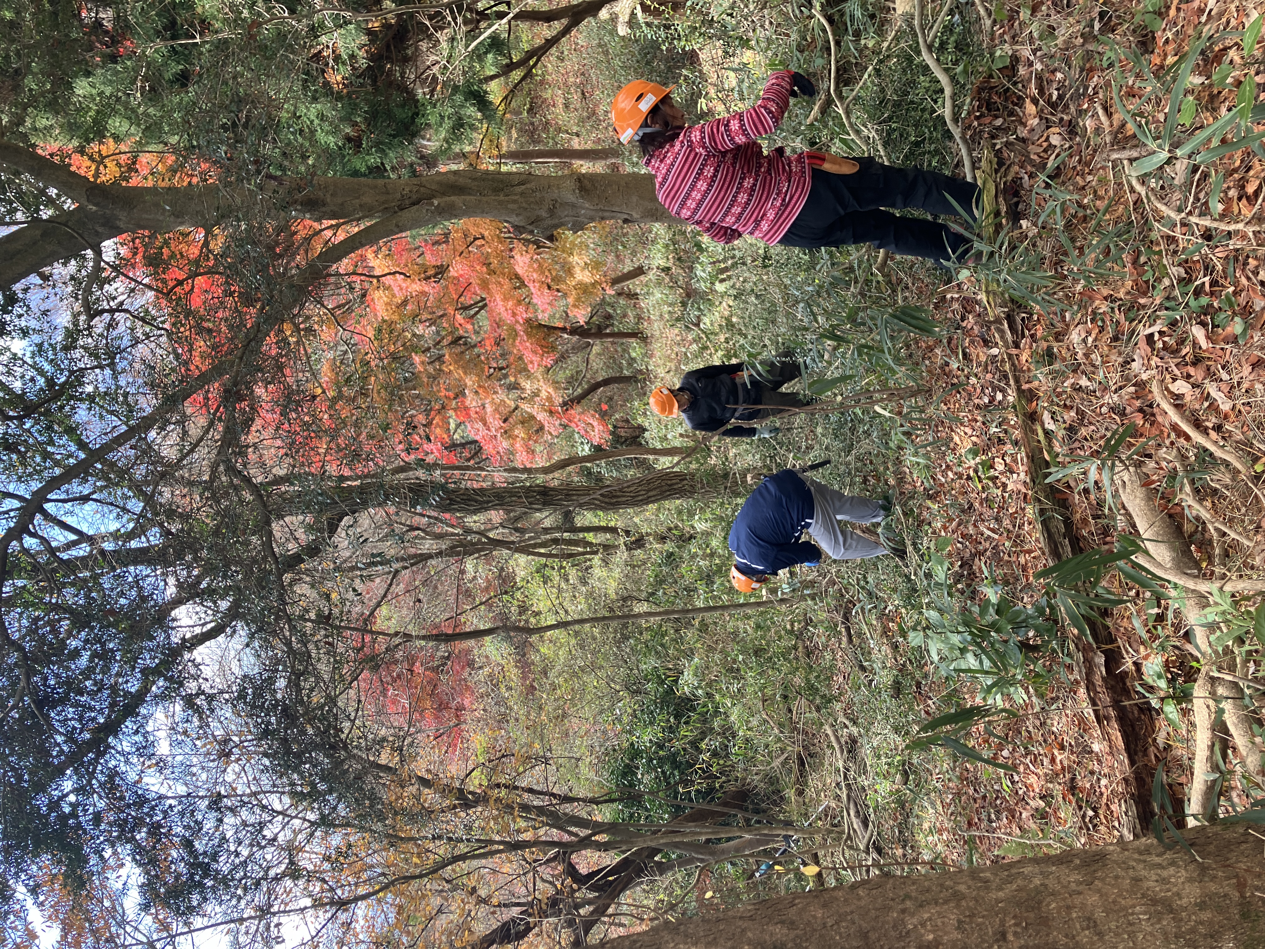 今回は、立ち枯れた樹木の伐採や倒木の処理、電動草刈り機によるネザサ刈り、そして苗木の保護作業を中心に行いました。冷たい空気が漂う中にも、陽光に照らされた紅葉が美しく、作業の合間に自然の彩りを楽しむことができました。